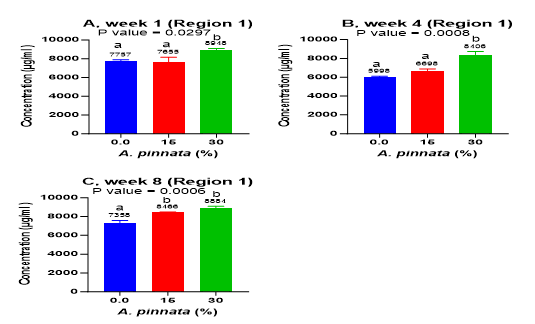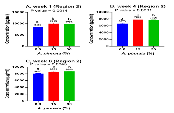 Additionally, the inclusion of azolla in the fish diet may contribute to this effect. Previous studies have shown that adding azolla to fish feed increases the protein content of fish muscle. Azolla is a good food source, meeting most of the protein and essential amino acid requirements of herbivorous fish [20]. Incorporating protein into fish feed can positively or negatively affect protein concentration in the gills and muscles of fish. This depends on several factors that affect protein concentrations in the gills and muscles, including the type and quantity of Azolla used, the type of fish, and environmental factors that affect the fish's diet [21] .