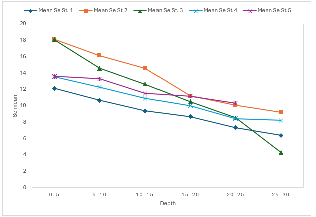 Overall, the highest Se concentrations in Station 2 ranged from 18.14 ppb in surface sediments (0-5 cm) to 9.22 ppb at the deepest layer (25-30 cm), suggesting local sources or sediment properties being favourable for Se accumulation. Similarly, Station 3 had high Se contents close to the surface (mean 18.08 ppb at 0-5 cm) then a sharp decline in Se content 9with depth to 4.31 ppb at a depth of 25-30 cm. Station 1 was the lowest at all depths with Se decreasing from 12.14 ppb at the surface to 6.38 ppb in the deeper layers. Stations 4 and 5 had intermediate levels with Station 5 slightly higher than Station 4 in the intermediate depths (10-25 cm) as can be seen in Figure 2.