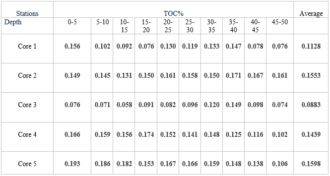 Table 1 and figure 2 shows the percentages of total organic carbon for the study area, the lowest percentage of total organic carbon was recorded at 0.058 at a depth of 10-15 cm in the third station , and the highest percentage reached approximately 0.193 at a depth of 0-5 cm in the fifth station.