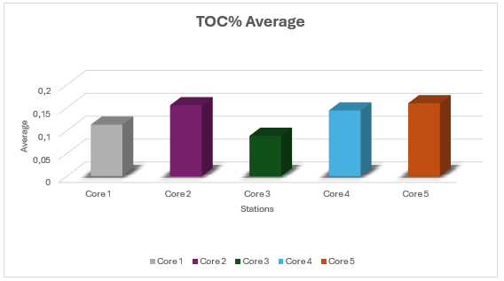 Most of the values of TOC are decreased gradually as depth increased. This means that lower concentrations of TOC are typically found in the deeper depths. The primary reason for this trend is that the upper layers of sediment contain a higher concentration of organic materials [14]. Excess TOC in the marine environment may be a result of a combination of an excess of plant debris combined with anthropogenic input. Elevated organic carbon concentrations are often associated with recurring algal blooms in the upper water column largely induced by nutrient enrichment of nitrogen and phosphorus. In heavily populated areas along the coast, anthropogenic inputs from pathways such as stormwater can cause serious and at times, ecologically disruptive events [15].