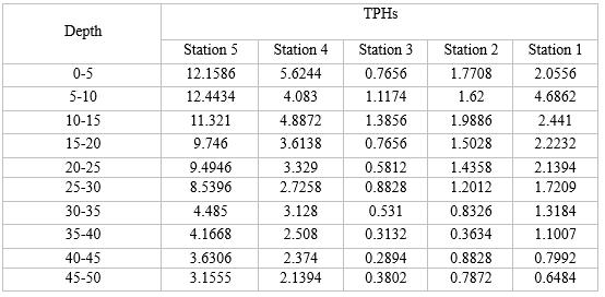 Table 2 and figure 3 shows the concentrations of total hydrocarbon compounds in stations concentrations increased at the shallowest depth of 0-5 cm about 12.1586 . The highest total hydrocarbon concentrations were recorded at station 5, specifically at a depth of 5-10 cm about 12.4434 , while the most significant decrease in concentrations was observed at station 3, at a depth of 45-50 cm about 0.2894.