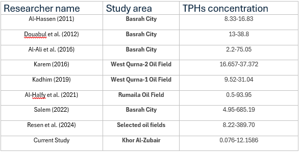 The present study demonstrated clear spatial and vertical variations in both total organic carbon and total hydrocarbon concentrations within the sediments of Khor Al-Zubair. The highest TOC and TPH levels were recorded in Station 5, suggesting stronger anthropogenic input and greater organic matter accumulation capacity in that area. Similarly, Station 3 had the lowest concentrations, suggesting that this station may have had a most likely relatively lower contamination level. The association between TOC and TPHs supports the role of organic matter in adsorption and retention of hydrocarbons, but more factors may have influenced distributions of each of the sampling stations, including sediment texture and degradation processes (natural or otherwise). Overall, findings presented here support the idea that in general, hydrocarbons are locally polluted in Khor Al-Zubair and not homogeneously distributed as a result of both natural sedimentary environment and anthropogenic specific impacts. The authors suggest that continuous hydrocarbon contamination monitoring should be made to understand historical pollution sources, as well as long-term measure to reduce impacts to the marine receiving environment.