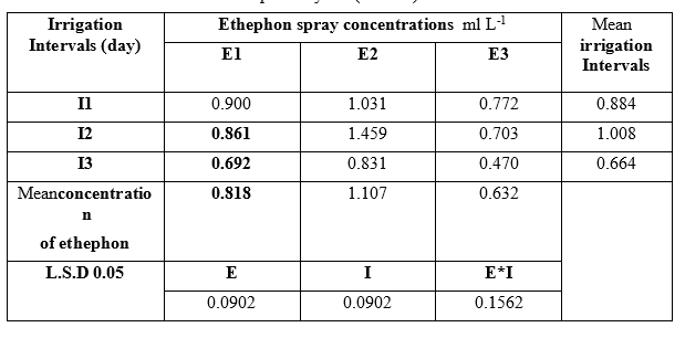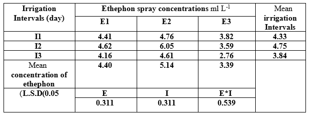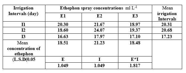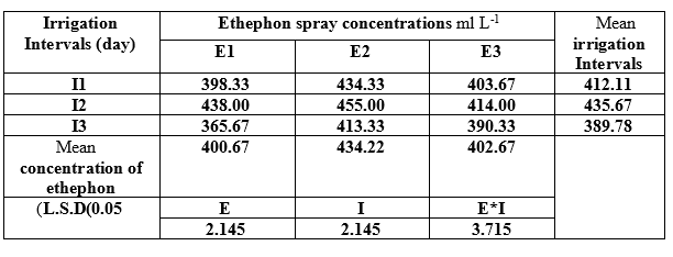 As for the interaction, Table 2 shows the superiority of irrigation treatment I2 with ethephon spray concentration E2 over most interactions, recording the highest mean for number of branches amounting to 455.00 branches m⁻², while the interaction between irrigation treatment I3 and ethephon concentration E1 gave the lowest mean for number of branches amounting to 365.67 branches.