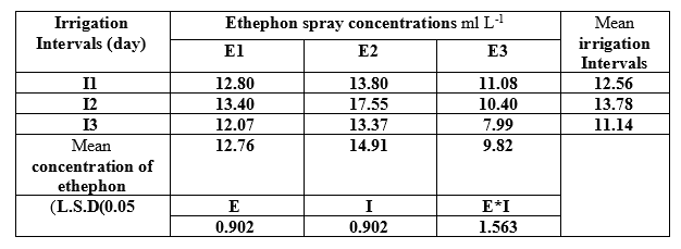 The experiment included two factors: the first factor was three irrigation periods (5, 10, and 15 days), symbolized I1, I2, and I3. The second factor was three ethephon concentrations (0, 0.5, and 1) ml L-1, symbolized E1, E2, and E3.