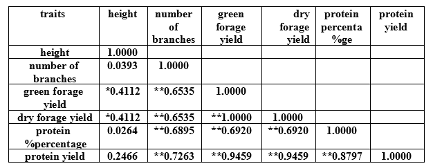 And this is confirmed by the highly significant correlation values between green forage yield and plant height and number of branches (r = 0.4112* and r = 0.6535**, respectively) (Table 7). The table also shows the presence of a significant decrease in forage yield with the increase of irrigation intervals, as irrigation treatment I3 recorded the lowest mean for forage yield amounting to 11.14 tons compared with the other irrigation treatments with a decrease percentage of 19.16, Table 3 shows the significant effect of the interaction between ethephon spray concentrations and irrigation treatments in green forage yield, as concentration E2 under irrigation treatment I2 achieved the highest mean for forage yield amounting to 17.55 tons ha-1.