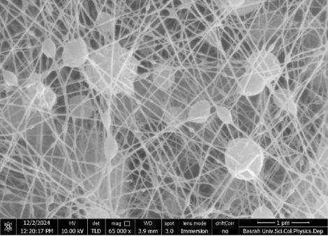 10wt% aqueous solution of PVA was prepared and 2wt% CS solution was prepared by dissolving CS in acetic acid water (90% v/v). The PVA / CS solution was mixed with 7:3 volume ratios., followed by a 0.5% (w/v) concentration of dried grape seed extract was added to the polymeric matrix, with continuous stirring for 24 hours at 50 °C. to ensure homogeneous distribution of the prepared nanomaterials. Load the prepared solution into a 5 mL syringe to start the electrospinning process under controlled conditions: voltage 20 kV, flow rate 1 mL/h, and a distance from the needle to the collector of 10 cm. Collect the nanofibers on aluminum foil, then dry at room temperature and store in desiccators until later use.