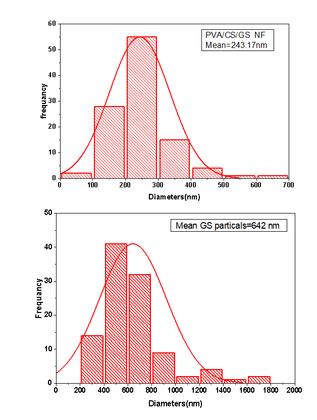 Figure (2): SEM (PVA/CS/GS) image of Nano-fibers and diagrams of mean diameters of grape seed Nano-particles.