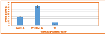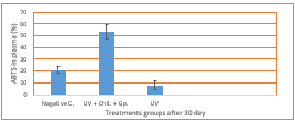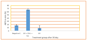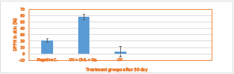 Our results showed that, after 30 days of daily for one hour to UV exposure showed a significant decrease (p ≤ 0.05) in plasma antioxidant activity which represented by a reduction DPPH levels of 6.6%. In contrast, the treatment group (PVA/CS/GSE) was showed a increase of plasma antioxidant activity(p ≤ 0.05), which recorded decrease in DPPH free radical scavenging 41.6% level (Figure 3). In skin tissues, the UV group exhibited the lowest value of antioxidant activity which represented by DPPH radical free scavenging