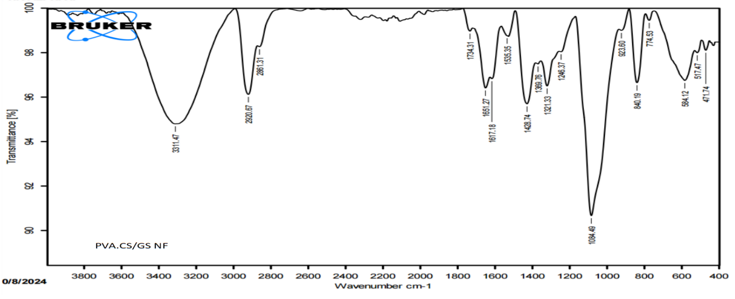 in the nano grape seed extract (GSE), there is the presence of a broader absorption band at 3311 cm⁻¹. The absorption band at 1617 cm⁻¹ confirmed that it is associated with aromatic carbonyl groups, while the band at 1734 cm⁻¹ indicated the presence of C=O stretching vibrations of carbonyl groups. The shifts and broadening of the peaks, along with the absence of significant new covalent bond formation, suggest that GSE was uniformly, effectively, and coherently encapsulated within the PVA/CS matrix due to numerous secondary molecular interactions and hydrogen bond.