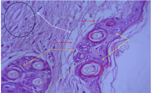 Figure (5) shows a transverse section of rabbit skin subjected to 30 days of UV radiation, followed by a 30-day post-exposure period without treatment. The tissue exhibits signs of marked Subepidermal bulla ( red arrows), dermal collagen degeneration, necrosis, and disorganization ( black circle), dermal edema (white arrow), parakeratosis (yellow arrow), hair follicle outer root sheath hypertrophy and hyperplasia (orange arrows), hair follicle outer root sheath necrosis (green arrow). Note the pathological alterations persist, with no obvious improvement. This sample was stained using E and H and observed at 400X magnification.