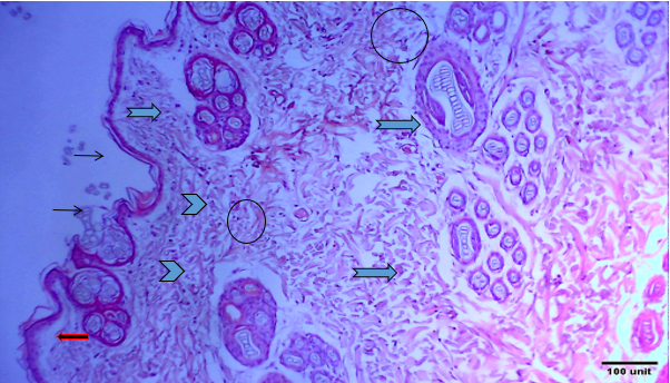Figure( 4) Transverse section of the negative control group skin, showing the normal epidermis as a stratified squamous keratinized epithelium (black arrow). The dermis consists of dense, irregular connective tissue (arrowhead), which contains blood vessels (circle), hair follicles (thick arrow), and sebaceous glands (red thick arrow). This image illustrates the typical structural integrity ofhealthy skin (H and E stain - 100X).