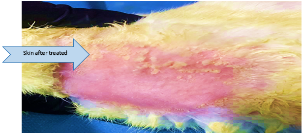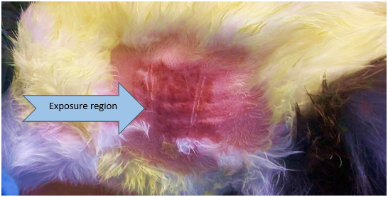 The clinical signs of the skin were identified visually through recorded redness, scaling, increased thickness, and texture changes in the exposed group of animals, which were documented through digital imaging. These were compared with the visual clinical evaluation of the morphological condition of the skin in the treated group of animals.