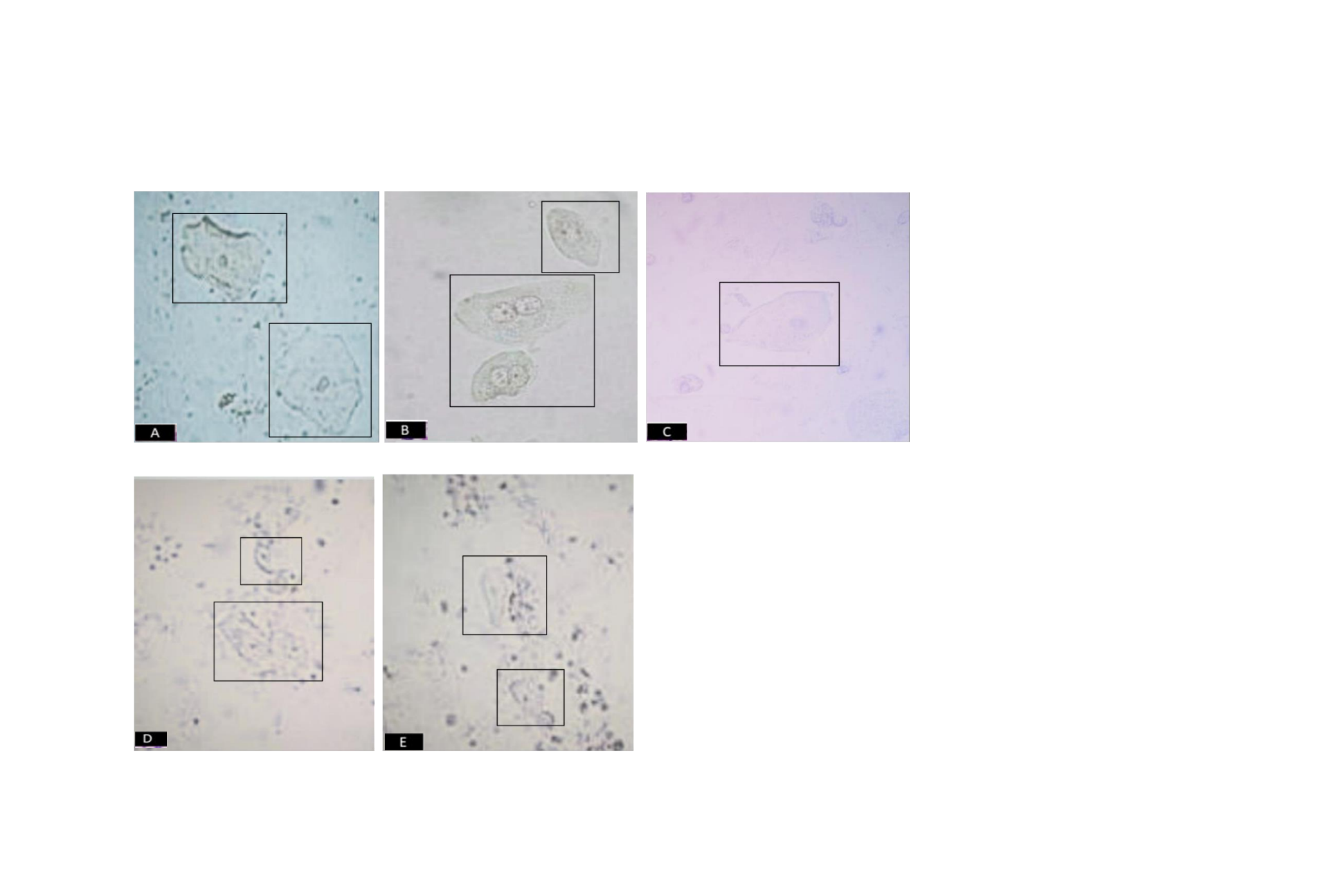 (A); Pemeriksaan Segera sebagai kontrol (B); Pemeriksaan Tunda 4 jam pada suhu dingin (C); Pemeriksaan tunda 5 jam suhu dingin (D); Pemeriksan tunda 4 jam dengan penambahan formaldehida 10% (E); Pemeriksaan tunda 5 jam penambahan formaldehida 10%.